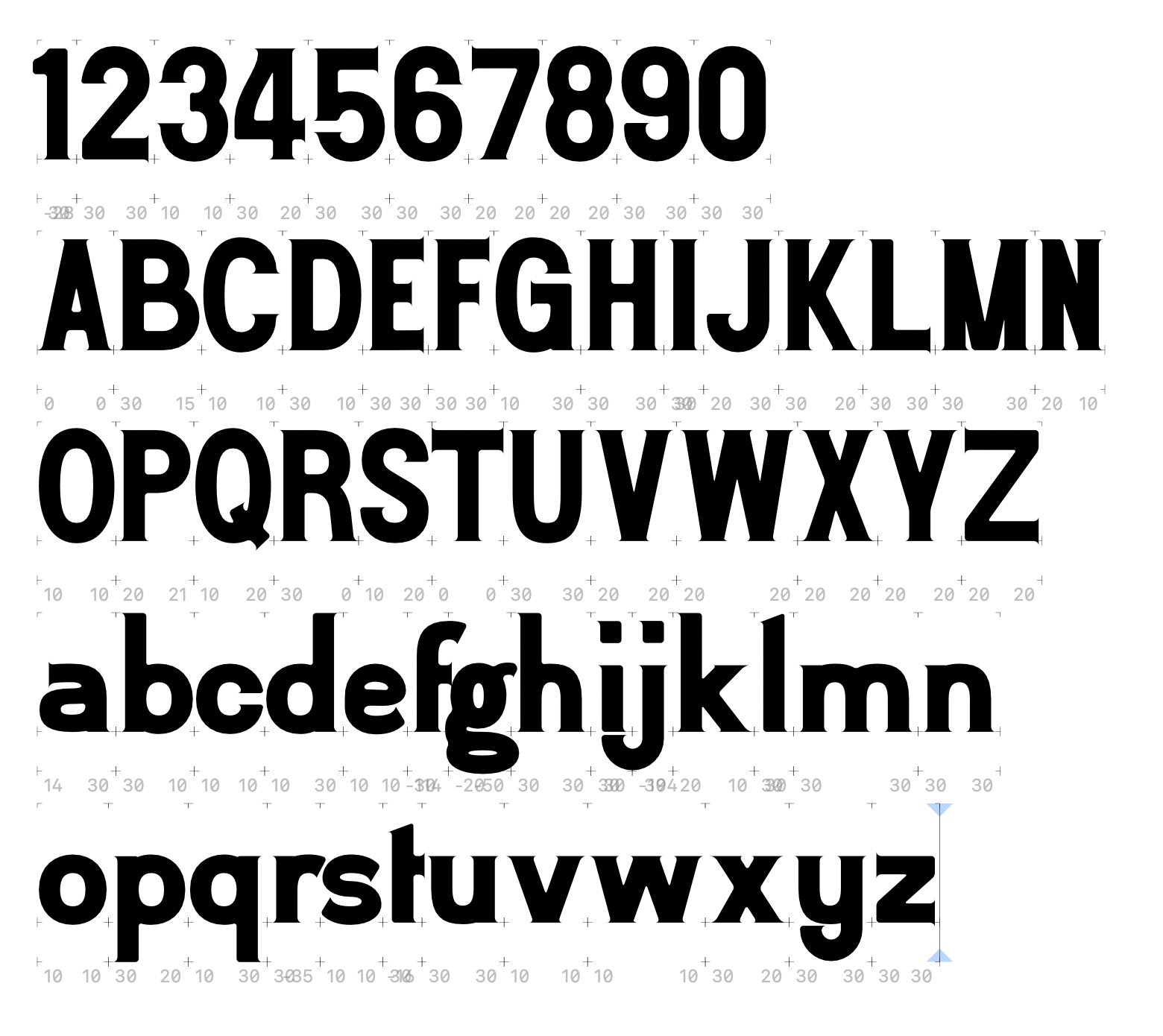 I've not got all the spacing right yet and haven't started kerning pairs. I'm just focusing on getting the forms right first.