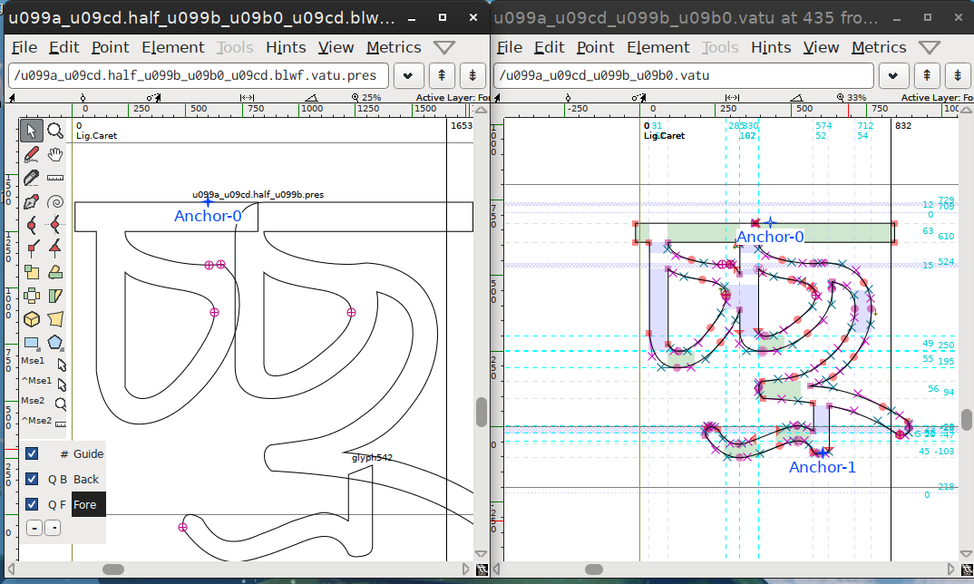 When I first made Mukti in 2002, I used the component model similar to Noto Bengali. However later shifted to full conjuncts model.